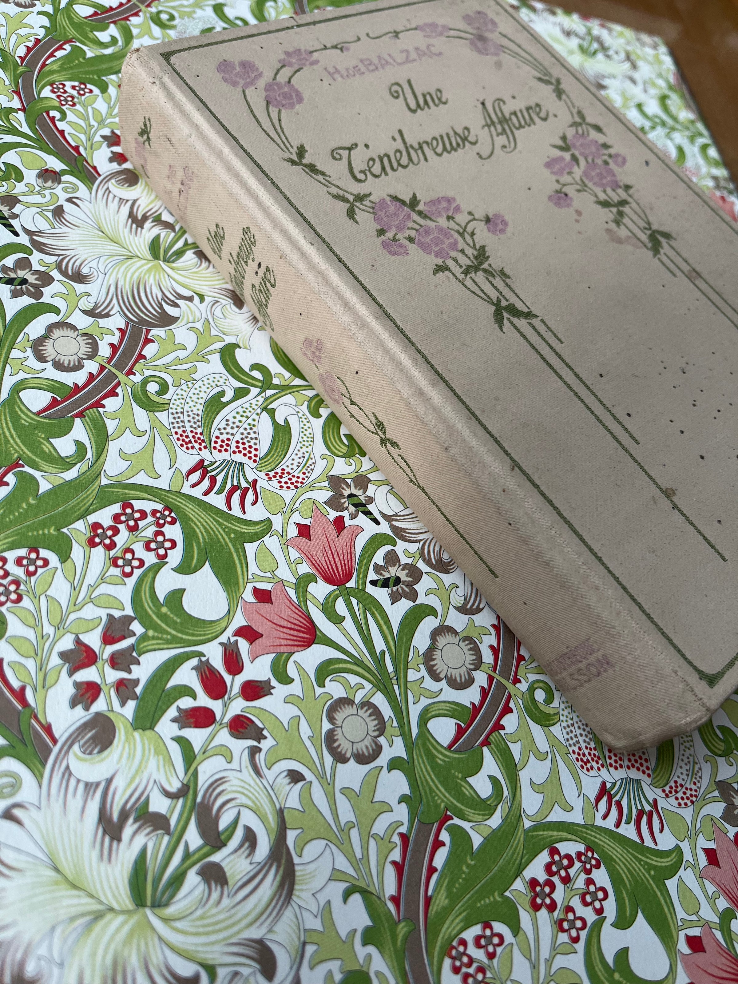 Il a été fabriqué dans la reliure recyclée d'un roman édité en 1935 : "Une ténébreuse affaire" d'Honoré de Balzac.